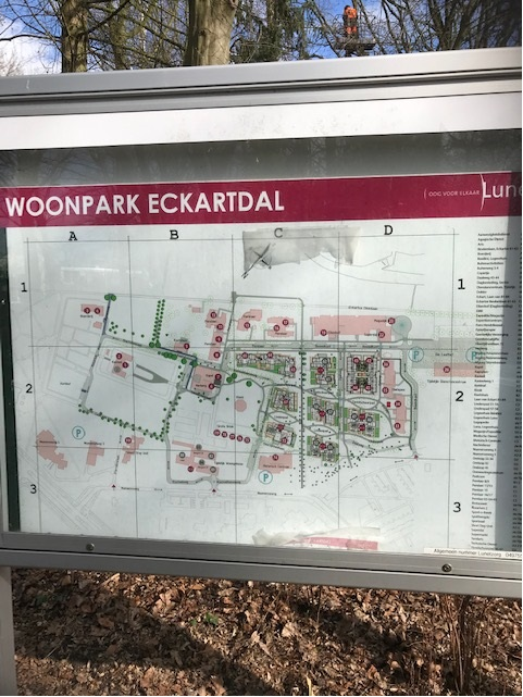 Het verrassende van onze Zorg voor de buurtvisites is dat we niet van te voren weten waar we tegenaan lopen; of in dit geval tegenaan rijden. Op onze weg van Sterksel naar Eindhoven rijden we tegen Woonpark Eckartdal aan. Een centrum van Lunet, in de Eindhovense wijk Begijnenbroek. Hier wonen 300 verstandelijk gehandicapten. Oog voor elkaar is hier het motto. En dat geloven we ook wel, gelet op het feit dat op borden wordt aangegeven dat er bijvoorbeeld een midgetgolf, een herberg en een boerderij is.