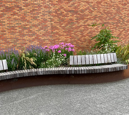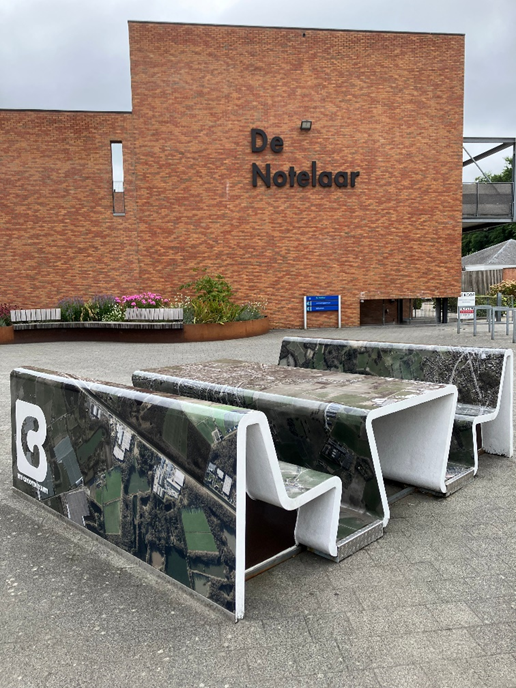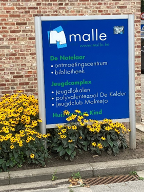Het wijkgebouw zou, ons inziens, het voorplein zo ingericht moeten hebben dat het uitnodigt tot ontmoeting en naar binnen gaan: met bankjes, fleurige bloembakken, een uitnodigend bord wat er binnen te doen is, een minibieb, een overzichtskaart van de wijk. TIP Of nog beter: zie verderop de toepassing van een omgevingfoto op een openbare zitplek in Oost-Malle. Goed voorbeeld doet volgen, hopen we.