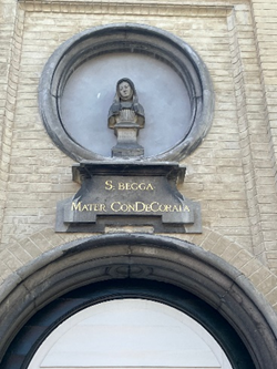 Beeld boven de ingang van het Begijnhof in Turnhout, een zorgame buurt avant la lettre