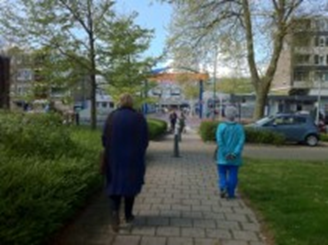 Het is omringd door balustrades van waaraf men zicht heeft op de activiteiten die daar plaats vinden. Een shantykoor dat er vanmiddag optreedt, is druk bezig met de voorbereidingen en dat geeft een hoop levendigheid. Als we later koekeloeren op de etages waar het kleinschalig wonen voor mensen met dementie zich bevindt, dan zien we van binnen prettig ingerichte ruimtes. We krijgen het echter niet helder over welke buitenruimte en bewegingsvrijheid deze doelgroep nu beschikt.