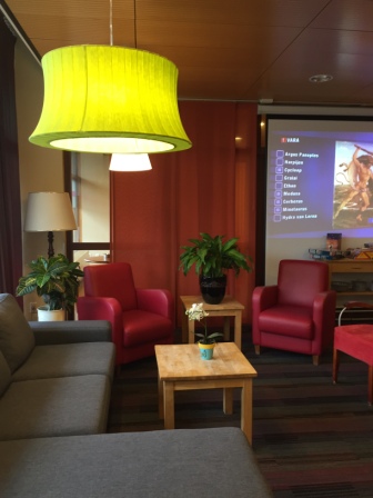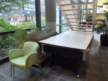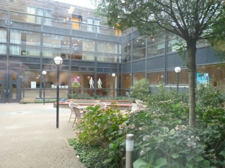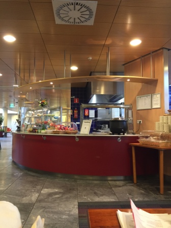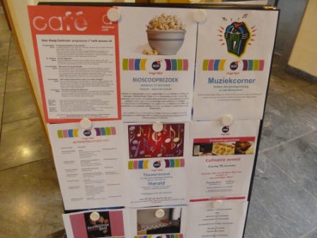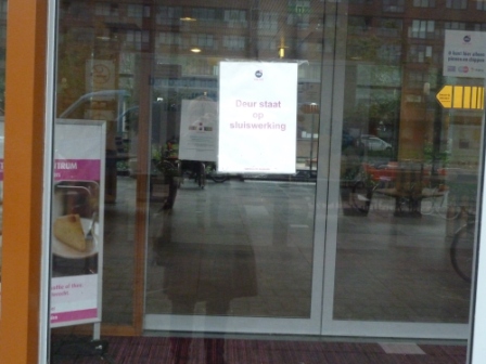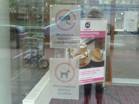Eenmaal bij het gebouw aangekomen geven plakkaten op het raam aan, dat waar we langs liepen een enorme langgerekte ontmoetingsruimte is; we lopen buiten langs een ruimte die lijkt op een rookruimte (die dan weer zonder enige vorm van vitrage; zijn rokers zo exhibitionistisch?), daarna een grotere ruimte met tafels en stoelen, die op de website als Grand Café staat vermeld, waar mensen zitten en dan de restauratieve counter en ontvangstruimte. Na zo’n veertig meter kom je dan bij de entree in de vorm van de ons zo welbekende sluis waarbij we altijd ons engelengeduld betrachten om beide deuren als horde te nemen.