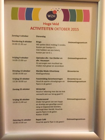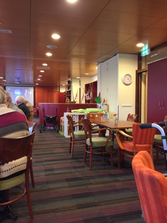 Er zitten ruim 20 mensen gezellig met elkaar te praten en iets te drinken aan verschillende tafeltjes. Voor de bewoners van Hoge Veld is dit een belangrijke plek als ontmoetingsruimte staat op de site; er worden veel activiteiten georganiseerd. De mensen die er zitten, komen -denken wij- veelal van de 90 zorggarant woningen die er zijn op de bovenliggende etages.