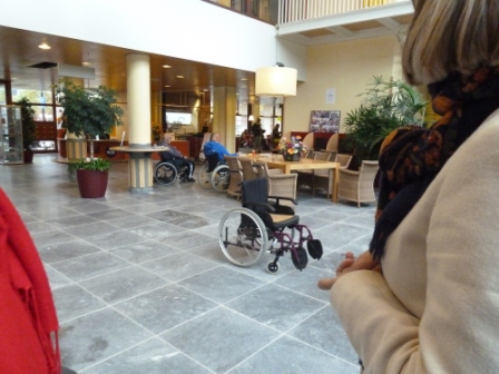 De huiskamers zijn voor 6 tot 7 personen. We vinden ze over het algemeen wel wat donker en dat geldt ook voor de gangen. Nu is het een erg grauwe dag, maar of dat nu de reden is? Wel hebben de bewoners een enorme loopruimte over de gehele etage. De etage heeft twee U vormen en komt wat ‘hokkerig’ over en contact met de buitenwereld is weinig vanzelfsprekend. Wel zijn er een paar zeer grote foto’s van beeldbepalende gebouwen in Den Haag wat gezellig aandoet en herkenning geeft. Als we er rond lopen hebben we steeds tweeledige gevoelens. Enerzijds is overal aan gedacht en is het beschikbaar zoals de gangen met ‘straat’ etalages, de veel en goed voorgesorteerde informatie over wat er te doen is, in de woonkamers zitten naast bewoners ook familieleden, etc etc, alsof de tips van Zorgvisite en uit de gids Thuis Voelen een op een zijn overgenomen. Aan de andere kant voelen de afzonderlijke woongroepen niet als een geheel, als een thuis, het is onoverzichtelijk, voelt druk, er zijn loslopende karren en andere obstakels, je mist frisse lucht en transparantie en mist de sferen van de afzonderlijke woongroepen. Het is nu allemaal veel, veel en lawaaiig. Bij de huiskamers wordt het dagprogramma vermeld en de foto’s van de aanwezige medewerkers hangen op het bord. TIP van het HUIS