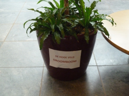 Twee grote planten met een geplakt plakkaat op de pot waar droomboom op staat. Later bij navraag blijkt er een project geweest te zijn dat bewoners wensen in deze bomen mochten hangen. ‘De boom droomt van de dag dat het plakkaat er af mag ’.