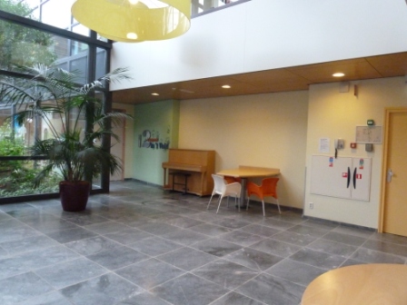 Wat zien we verder? Een leestafel met lekkere stoelen, met daarachter een internethoek, een piano verloren in een hoekje, uitzicht op een binnentuin met aan de over kant een kinderopvang.