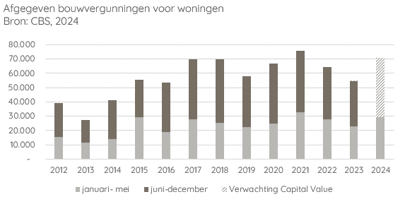 Het aantal afgegeven bouwvergunningen voor nieuwbouwwoningen is in mei uitgekomen op 6.858, waarmee de trend van hogere aantallen vergunningen per maand in 2024 bestendigt. Gemiddeld werden er in 2024 5.915 vergunningen per maand afgegeven (tot en met mei), terwijl dit gemiddelde in voorgaande jaren veel lager lag. Als deze trend wordt vastgehouden tot het einde van het jaar, kan het aantal afgegeven vergunningen oplopen tot 71.000, wat een groei van 30% ten opzichte van 2023 zou betekenen. De aandacht die er vanuit Den Haag gegeven wordt aan het opvoeren van de nieuwbouw lijkt daarmee steeds meer concrete vruchten af te werpen. Toch is het belangrijk om de nieuwbouw van met name huurwoningen te blijven ondersteunen, aangezien de eerste tekenen van stijgende bouwkosten zich inmiddels voordoen en het beschikbare kapitaal niet toereikend is om voldoende betaalbare huurwoningen te bouwen.