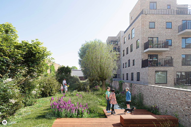 In het Belgische Gent hebben bewoners een voormalig fabrieksterrein getransformeerd tot de grootste cohousing-gemeenschap van Vlaanderen: Bijgaardehof. Er zijn drie woongroepen gehuisvest die de gemeenschappelijke ruimtes, een tuin en een atelier delen. Ze wonen samen met een vleermuizenkolonie, die in de kelders van de oude fabriek huist (beeld: wadi naast Bijgaardehof; Gents MilieuFront).