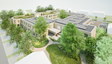 Op Texel is Het Groene Verpleeghuis bijna gereed. Het is een circulair en energiezuinig gebouw voor bewoners, vrijwilligers en medewerkers. Het is ontworpen door architectenbureau OostWest in opdracht van zorgorganisatie De Omring. Zee, duinen en voorzieningen zijn allemaal nabij. Ouderen kunnen zo op hun geliefde eiland oud worden (foto: OostWest).