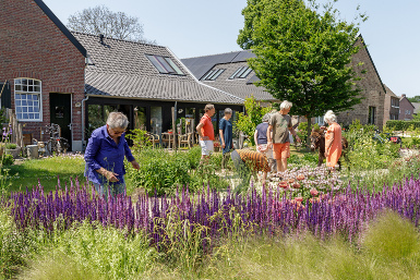 In een groene en dierrijke omgeving in Putten kunnen mensen met dementie voluit leven en zichzelf zijn op ZorgErf Buiten-Land. Bewoners komen dagelijks buiten en helpen met het verzorgen van de dieren of in de tuin. Het erf ziet er vakantieachtig uit en ligt midden in de bossen (foto: ZorgErf).