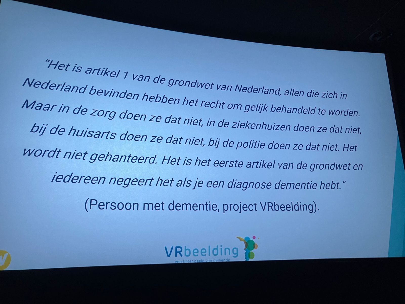 Iedereen moet begrijpen dat goed leven met dementie een ‘groot ding’ is waar we niet omheen kunnen, zegt iemand in de zaal. Franka en SImone bevestigen dit met een aangrijpende slide, waarin ze een deelnemer aan hun onderzoek citeren die stelt dat artikel 1 van de Grondwet niet (meer) geldt voor mensen met dementie.