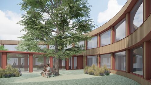 In een Noord-Gronings dorp kan een instelling in dit verband rekening houden met noaberschap en mantelzorg. In een meer stedelijke context, zo vertelt Wilma, heeft dat andere consequenties voor een ontwerp. Zo is een project in Alkmaar waaraan Reni werkt (foto onder) veel meer naar buiten gericht. Alle kamers van de bewoners bevinden zich op de verdiepingen boven de begane grond. De reden is het personeelstekort, waarbij een onderscheid wordt gemaakt in zorgtaken en activiteitenbegeleiding en bewoners daardoor de hele dag beneden doorbrengen.