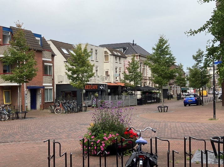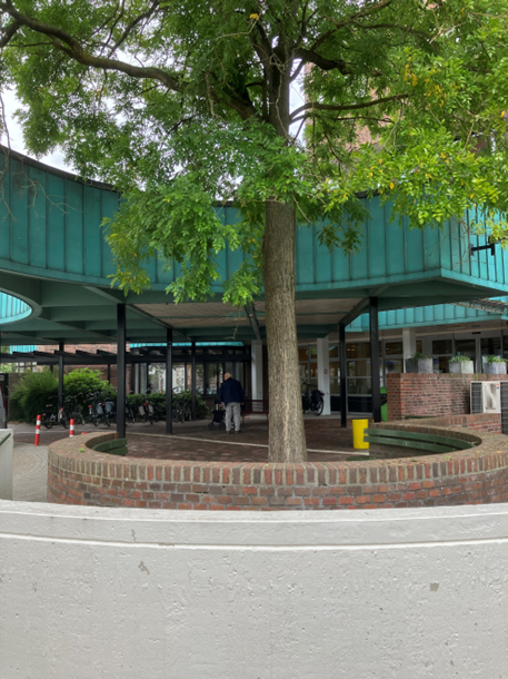 Nu is het niet meer dan keurig onderhouden gras, een rookhok, een niet zo comfortabel ijzeren ribbelbankje en fietsenklemmen waar niemand zijn of haar fiets zet.
