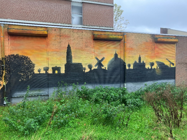 Dat het er wel inzit, blijkt wel aan het eind van onze wandeling, een fraaie muurschildering met het stadsprofiel van Middelburg.