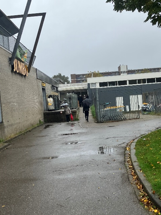 Over het winkelcentrum uit 1973 en blijkbaar particulier eigendom, kunnen we kort zijn. Dat is zeer gedateerd en dat weet men zelf ook goed. Blijkbaar is over de vernieuwing 13 jaar heen en weer met de gemeente Middelburg gesteggeld. Een ondernemer was het in 2018 zo beu dat hij zelfs een petitie is gestart waarmee de lokale media is gehaald. Kennelijk is in 2020 de vernieuwingskogel door de kerk gegaan, nadat de gemeente Middelburg het ontmoetingscentrum voor een vestiging van de Aldi heeft ingeruild. Het kan verkeren. Als wij van de achterkant aanlopen verbaast het ons wel hoe weinig grootverdieners als Jumbo en Aldi zich verantwoordelijk voelen voor hun bijdrage aan een aangename wijk.