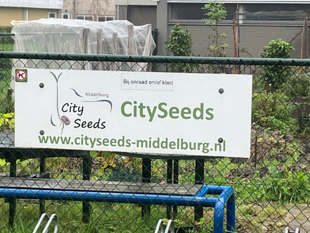 We lopen en lopen. Wellicht is het druilerige, grijze weer er debet aan. Maar de blauw groene paaltjes om de blauw groene wandelroute langs de Dauwendaelese watergangen te lopen, we vinden ze niet. We generen ons als sociaal geografen. Zou het ons alleen overkomen of ook anderen? Waarom niet veel meer wegwijzers met afstanden naar wat er wel is in de wijk? TIP Ook al vinden we het weinig wat er op zo’n grote wijk met zo’n groot oppervlak beschikbaar is (en ook hier weer valt de gemeente Middelburg door de mand -knipoog- als ze schrijft dat er veel voorzieningen zijn) er is wel wat: City seeds www.cityseeds-middelburg.nl heeft geweldige moestuinen ontwikkeld tussen de hoge flats.