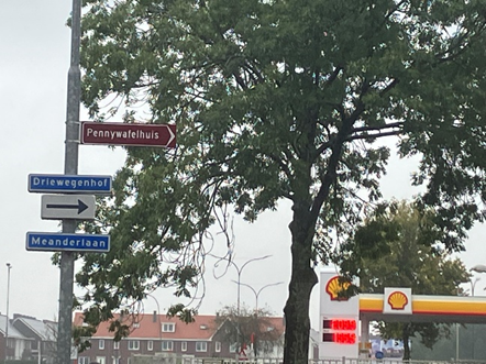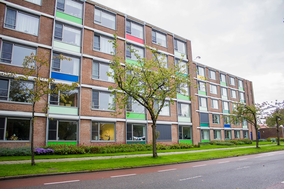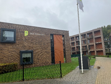 De blauw groene wandelroute moet hier starten net als bij het verpleegcentrum Buitenrust wat we later nog tegenkomen, maar een bord dat de ouderen en hun bezoekers aanmoedigt om de wandeling te maken treffen we niet aan. En ook niet een uitnodiging om naar binnen te gaan, wat je er kunt aantreffen etc. TIP De zelfverklaard kunstkenner onder ons ‘ergert ’zich er aan dat de kleuren niet overeen komen met de heldere primaire kleuren van Piet Mondriaan.