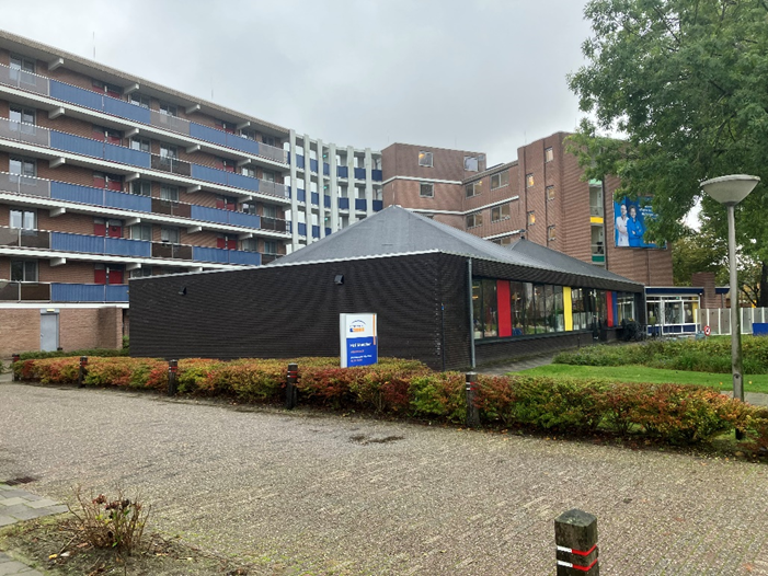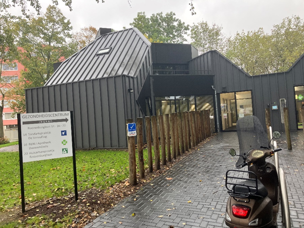 We passeren op de terugweg nog, aan de andere kant van het winkelcentrum, het gezondheidscentrum. Ai, wat een zwart gebouw. Daar stap je niet vrolijk makend naar binnen. Hopelijk wel eruit.