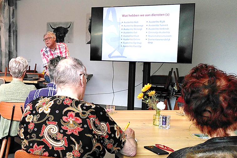 Jan vertelt over de droom die de inwoners van het dorp al in 2007 hadden. Zij wilden graag dat iedereen er prettig oud kan worden en niet hoeft te verhuizen als er zorg nodig is. En zo is het allemaal begonnen. Het hele verhaal heeft Jan opgeschreven in het boek “Austerlitz doet het zelf.” Een aanrader! En buitengewoon leerzaam voor (beginnende) initiatieven. Dat beaamden ook twee deelnemers aan de excursie die het boek al van tevoren gelezen hadden.