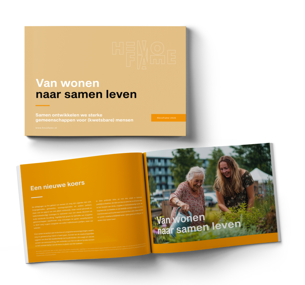 De kennis die HevoFame in de loop der jaren heeft opgebouwd wil ze graag delen. Binnenkort komt HevoFame met een publicatie over ontwerpen voor mensen met dementie. “We willen bijdragen aan kleine geluksmomenten voor mensen die kwetsbaar zijn”, zegt René. HevoFame wil daartoe met haar projecten bijdragen aan inclusieve en zorgzame woonomgevingen. “Het belangrijkste is om de mens centraal te stellen en niet het systeem”, benadrukt René. “We bouwen zo met onze partners aan een toekomst waarin zorg, wonen en welzijn samen gaan.”